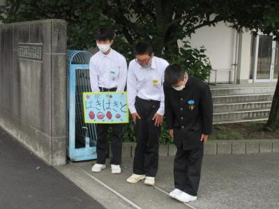 生徒会は、年間を通して「あいさつ日本一」を目指してあいさつ運動を行っています。今週は環境委員会も加わりあいさつをしています。「立ち止まって」「明るく笑顔で」「相手の目を見て」を基本に行っています。